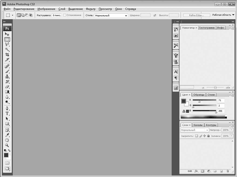 Теперь вы имеете представление о цифровом изображении и знаете, из чего состоит и как формируется любая картинка на экране. Настало время запустить программу Photoshop и познакомиться с ее интерфейсом (рис. 2.1).