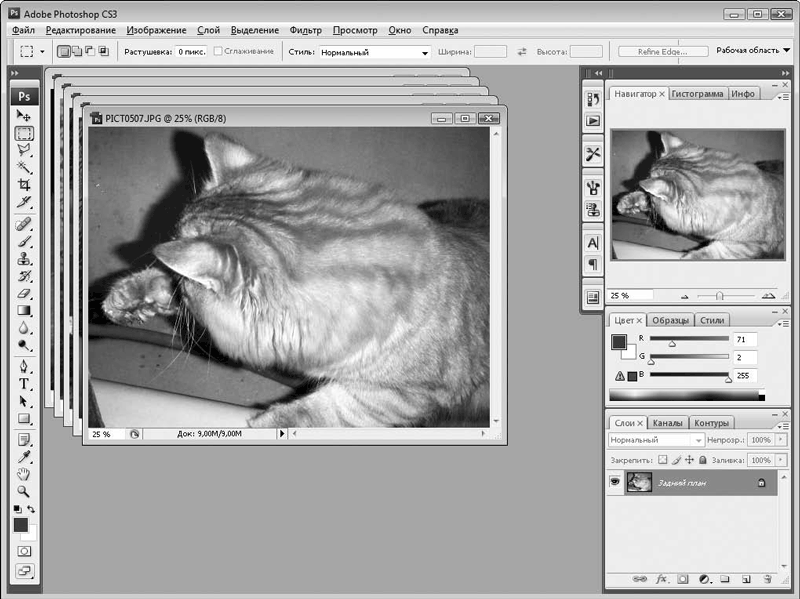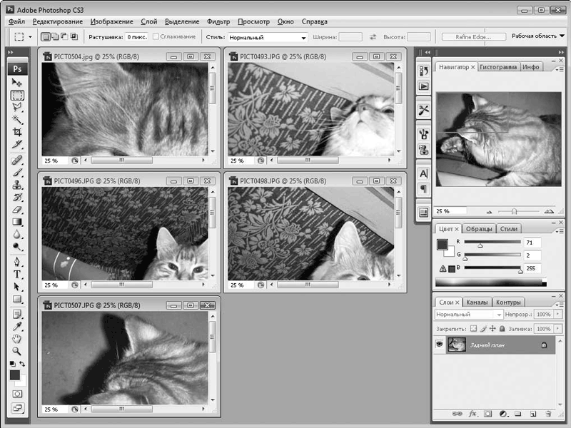 В правой части окна приложения вы видите несколько небольших окон. Они называются палитрами. Палитры можно перемещать, закрывать и вновь отображать, а также изменять их размеры. Каждая палитра предназначена для настройки определенных инструментов, а также для удобства работы с изображением и отдельными слоями. На одной из палитр, например, настраивают форму и размер кисти, на другой вы можете масштабировать изображение, на третьей выбирать шрифт и атрибуты текста, на четвертой управлять слоями и т. д. По умолчанию открыты три палитры (Навигатор, Цвет и Слои), причем каждая из них содержит несколько вкладок, которые, по сути, являются самостоятельными палитрами.