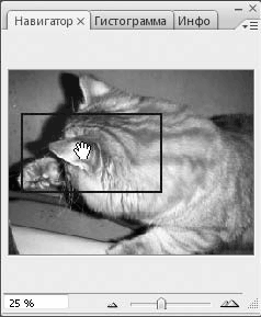 Если все изображение не помещается в видимой части окна документа, в правой и нижней части окна появляются полосы прокрутки, с помощью которых можно «двигать» изображение в окне. Но есть и более удобный способ. Если все изображение не помещается в окне документов, на миниатюре изображения (на палитре Навигатор) появляется прозрачный прямоугольник с красной рамкой. Все, что находится в пределах прямоугольника, вы видите в окне документа. Все, что расположено вне рамки прямоугольника, скрыто за границами окна. Этот прямоугольник можно перемещать по миниатюре изображения. В результате в него будут попадать новые фрагменты изображения, и, соответственно, все, что вновь попало в прямоугольник, будет отображено в окне документа. Чтобы изменить положение прямоугольника на миниатюре, нужно подвести к нему указатель мыши и, удерживая левую кнопку нажатой, перемещать мышь в нужном направлении. Как только необходимая область изображения отобразится в окне документа, кнопку мыши можно отпустить (рис. 2.5). Перемещать изображение можно также с помощью инструмента Рука на панели инструментов, но об этом мы расскажем, когда будем знакомиться с этой панелью.