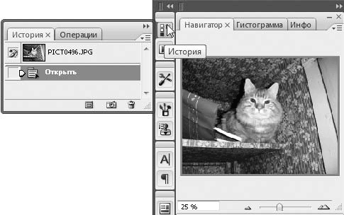 Кроме того, существует еще достаточно много палитр, которые в данный момент не отображаются в окне программы. Их можно открыть, выбрав имя нужной палитры в меню Окно или нажав определенную кнопку на панели, расположенной слева от палитры Навигатор. Так, нажатие верхней кнопки приводит к появлению палитр История и Операции (рис. 2.6).