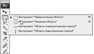 Обратите внимание, на кнопках некоторых инструментов (в правом нижнем углу) есть крошечная треугольная стрелка. Эта стрелка означает, что под данной кнопкой содержится несколько инструментов. Чтобы отобразить меню с инструментами, нужно щелкнуть на данной кнопке и удерживать ее нажатой несколько мгновений. Появится меню, в котором можно выбрать любой дополнительный инструмент. Так, если вы нажмете кнопку Прямоугольная область, то появятся еще три инструмента: для выделения овальной области, горизонтальной и вертикальной строки (рис. 2.7).