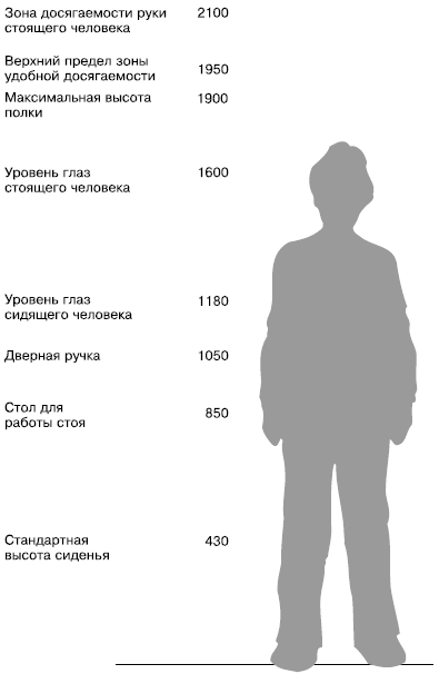 Для нормального функционирования человеку очень важны зоны движений: ближняя, нормальная и комфортная. В последней области стоящему или сидящему человеку удобно выполнять работу с максимальной силой или точностью при минимальном утомлении. Поверхность стола, полки и ящики, где лежат часто используемые вещи, должны располагаться именно в этой зоне. При планировании габаритов мебели (рис. 1.1) также важна зона максимальных движений, или досягаемости.