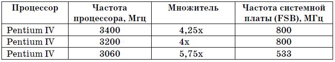 Все современные процессоры работают на частоте, которая в несколько раз превышает частоту системной платы. Величина, на которую частота процессора превышает частоту системной платы, называется множителем. Так, у Pentium IV, работающем на частоте 3400 МГц, множитель составляет 4,25x (частота системной платы равна 800 МГц).