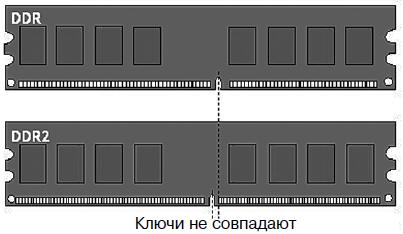 DDR и DDR2 обратно несовместимы (рис. 4.1), то есть в слот для DDR2 вы физически не сможете установить DDR-модуль памяти, и наоборот (если начнете упорствовать и насильственно вставлять модули в чуждые им разъемы, убьете материнскую плату).