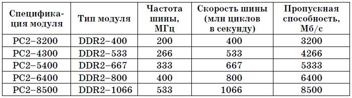 Как и для SDRAM, для DDR есть свои спецификации PC* (табл. 4.2), а для DDR2 разработаны новые спецификации – PC2* (табл. 4.3). Перед покупкой модулей памяти нужно убедиться, что чипсет поддерживает выбранный тип памяти. В третьей главе мы приводили таблицы совместимости чипсетов и типов памяти. Теперь вы узнаете, откуда берутся эти загадочные маркировки вроде DDR II 533 (PC4200).