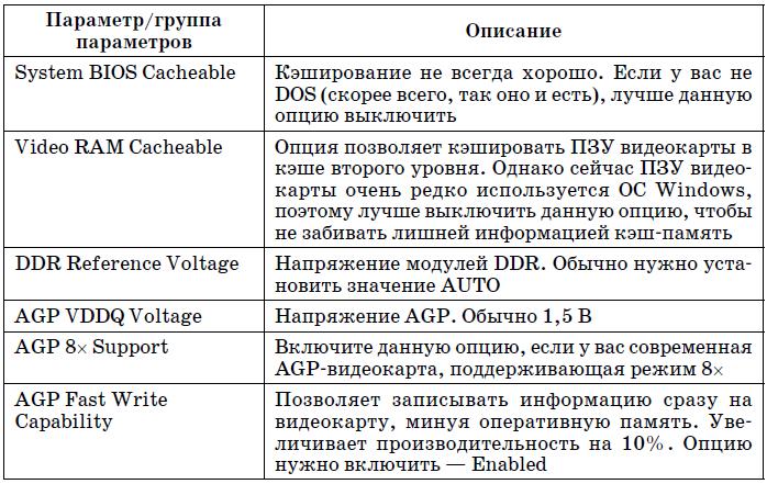 В табл. 5.2 приведены наиболее часто встречающиеся (в разных версиях BIOS) параметры группы Advanced BIOS Features.