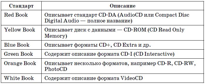 Стандартов CD очень много. Самым первым стандартом была «Красная книга»: первая спецификация AudioCD была выпущена в красной обложке, поэтому ее так и назвали. После этого было выпущено еще несколько цветных книг (табл. 7.1).
