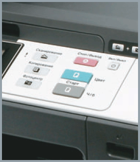 На передней панели МФУ всего шесть кнопок (не считая кнопки включения-отключения самого аппарата). Основную часть управляющих функций выполняет широкий (диагональ 10,7 см) отклоняемый цветной сенсорный экран. Экранные команды организованы настолько интуитивно понятно, что необходимости в предварительном чтении документации не возникает. Легкую досаду вызывает лишь сам дисплей: ему не помешало бы более высокое разрешение, да и углы обзора могли быть пошире.