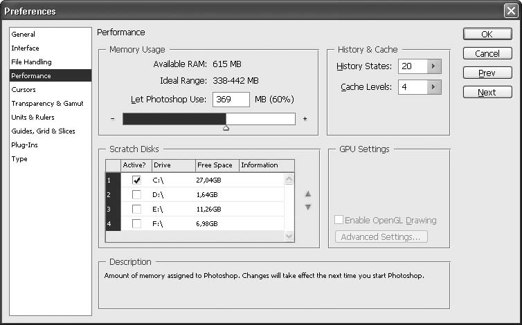 В разделах Interface (Интерфейс) и File Handling (Управление файлами) окна Preferences (Установки) лучше пока оставить все как есть и перейти в раздел Performance (Производительность) (рис. 2.9).