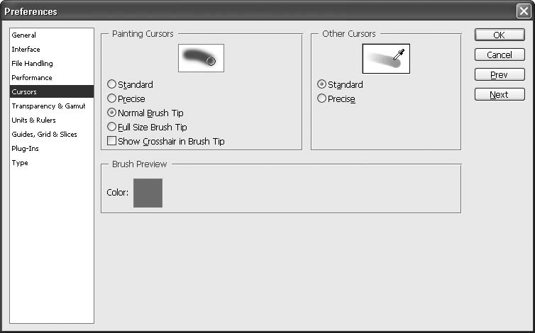 Если выбран вариант Standard (Стандартный), Normal Brush Tip (Нормальный размер кисти) или Full Size Brush Tip (Увеличенный размер кисти), а вы хотите использовать Precise (Точный), то не обязательно открывать окно установок программы. Достаточно нажать клавишу Caps Lock. Повторное нажатие возвратит указателю мыши прежний вид.