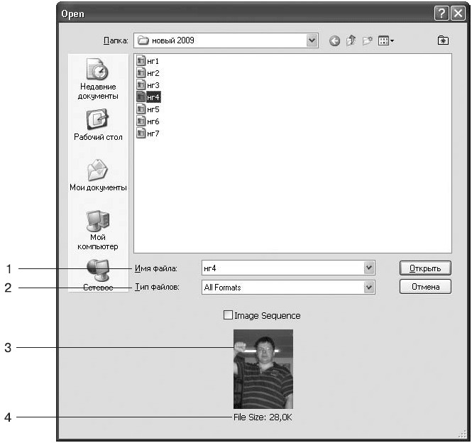 3. Окно предварительного просмотра открываемого изображения. Очень полезно, если в диалоговом окне документы видны в виде значков.