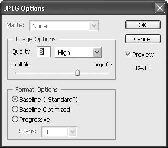 В области Image Options (Настройки изображения) можно выбрать степень сжатия изображения. В поле Quality (Качество) вводится коэффициент качества – от 0 (максимальные потери) до 12 (потерь нет). Флажок Preview (Просмотр) позволяет оценить качество изображения при выбранных установках формата. Под ним отображается размер измененного файла в килобайтах.