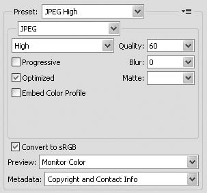 Выберите в окне File ? Save for Web & Devices (Файл ? Сохранить для веб и устройств) в списке форматов – справа, под словом Preset (Заготовка) – пункт JPEG. Рассмотрим настройки формата (рис. 4.6).