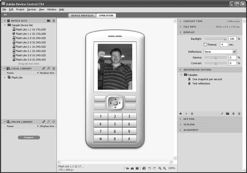 3. В появившемся окне нажимаете кнопку Device Central, после чего откроется окно программы Adobe Device Central (рис. 4.8).