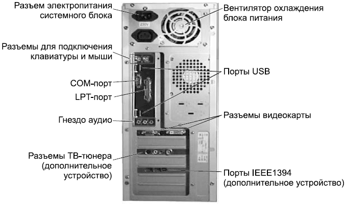Набор разъемов у разных материнских плат различный, набор установленных устройств также отличается. На рис. 1.20 показан примерный вид задней стенки системного блока. Рассмотрим разъемы и их назначение поподробнее.
