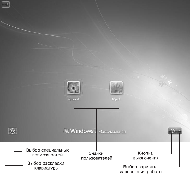 В левом нижнем углу экрана приветствия имеется кнопка Специальные возможности, с помощью которой можно включить экранную клавиатуру, режим озвучивания, экранную лупу и другие средства для пользователей с ограниченными физическими возможностями. А в правом нижнем углу экрана вы найдете кнопку для выключения компьютера. Если щелкнуть на стрелке ? справа от этой кнопки, можно выбрать другой способ завершения работы, например Перезагрузка или Сон. Подробнее способы завершения работы будут рассмотрены далее.