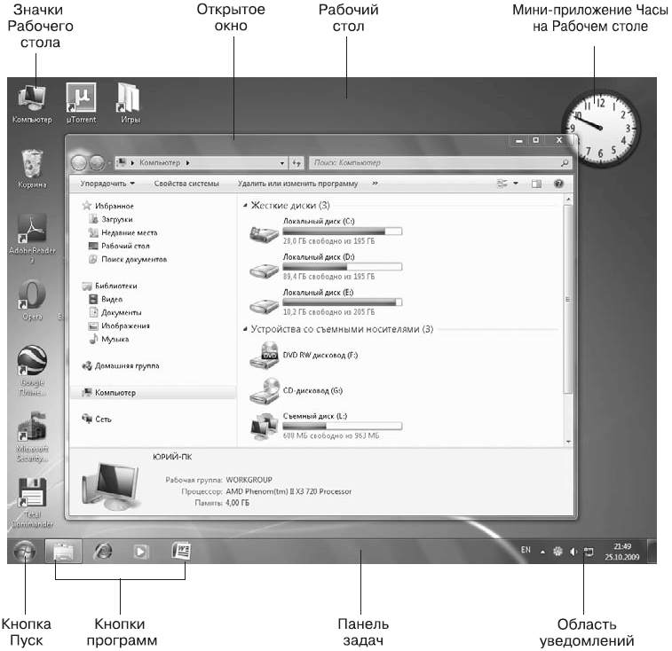 После входа в систему вы увидите Рабочий стол, на котором могут размещаться значки, окна и другие элементы. В нижней части Рабочего стола находится Панель задач с кнопкой Пуск в левом углу и областью уведомлений в правом. При первом знакомстве с интерфейсом Windows 7 (рис. 3.4) можно отметить такие новшества, как полупрозрачные окна, меню и панели в стиле Windows Aero, полностью переработанная Панель задач, списки переходов, новые эффекты управления окнами и другие усовершенствования.
