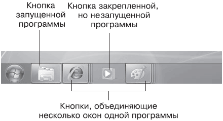 На Панели задач Windows 7 вы можете увидеть кнопки трех видов (рис. 3.6):