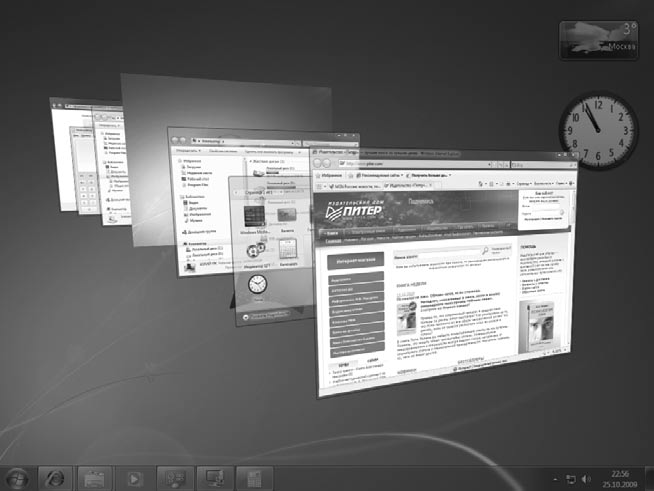 В предыдущих версиях Windows для переключения между работающими окнами можно было использовать комбинацию клавиш ALt+Tab. В Windows 7 это сочетание также используется, но в процессе переключения пользователь может видеть эскизы содержимого окон (так называемый эффект Flip), а выбранное окно при этом будет отображаться в полную величину (рис. 3.11).