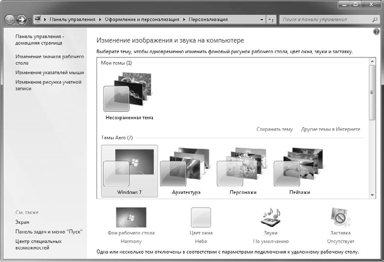 Для настройки Рабочего стола используется окно Персонализация (рис. 3.13), позволяющее легко выполнить индивидуальную настройку интерфейса Windows 7. Для открытия этого окна щелкните правой кнопкой на любом свободном месте Рабочего стола и выберите в контекстном меню пункт Персонализация. Это же окно можно вызвать, выполнив команду Пуск ? Панель управления ? Оформление и персонализация ? Персонализация.
