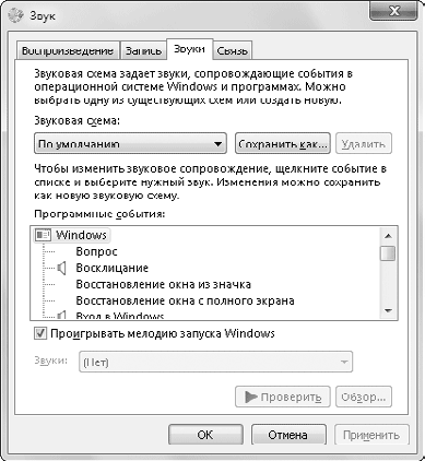 Чтобы вызвать окно изменения звуковой схемы, откройте окно Персонализация и щелкните на ссылке Звуки (см. рис. 3.13). В появившемся окне вы можете выбрать звуковую схему из раскрывающегося списка или создать собственную, изменяя звуки для различных системных событий (рис. 3.18).