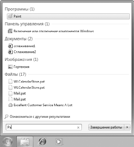 Рассмотрим пример использования строки поиска для запуска графического редактора Paint. В Windows ХР для этого нужно было выполнить такую последовательность действий: Пуск ? Все программы ? Стандартные ? Paint. В Windows 7 эту же операцию можно осуществить так.