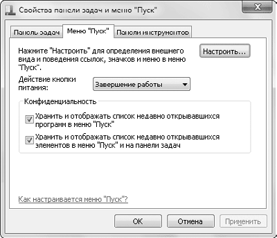 Чтобы открыть окно свойств меню Пуск, щелкните правой кнопкой мыши на кнопке Пуск и выберите в контекстном меню пункт Свойства. При этом откроется окно, показанное на рис. 3.27.