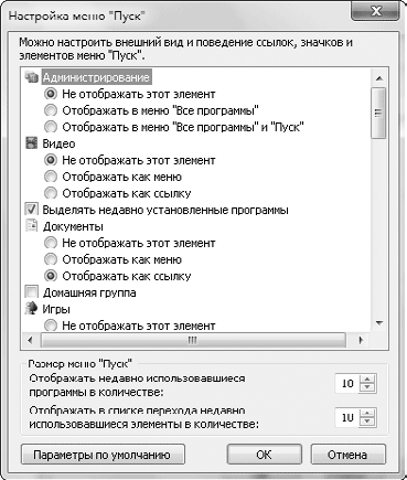 При нажатии кнопки Настроить откроется окно настройки меню Пуск (рис. 3.28). В верхней части появившегося окна присутствует обширный список параметров, большинство из которых позволяют включать или отключать отображение отдельных элементов меню.