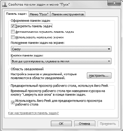 Для открытия окна свойств Панели задач щелкните правой кнопкой мыши на любом свободном месте Панели задач и выберите пункт Свойства. Для установки свойств меню Пуск и Панели задач используется одно общее окно, состоящее из нескольких вкладок. В данном случае активной будет вкладка Панель задач (рис. 3.30).