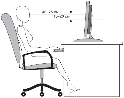 Правильная посадка за столом. Расстояние от глаз до монитора должно составлять 40–75 см, а центр экрана должен находиться на 15–20 см ниже их уровня (рис. 2.2). Клавиатура располагается на расстоянии 10–30 см от края стола – таким образом пальцы будут находиться на уровне запястий, параллельно полу, а плечи будут расслаблены.