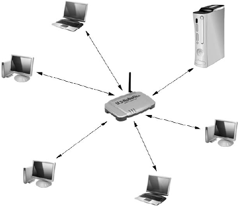 Базовый набор служб, или режим инфраструктуры, – еще один режим работы беспроводной сети, который подразумевает использование центрального управляющего узла, называемого точкой доступа (Access Point). Все беспроводные станции подключаются к этой точке доступа (рис. 8.2).