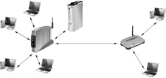 Возможности точки доступа на этом не заканчиваются. Так, точка доступа может использоваться не только для обслуживания беспроводных устройств: зачастую точка доступа представляет собой коммутатор стандарта 100Base-TX или ему подобного, что позволяет соединять беспроводной и проводной сегменты сети в одно целое с возможностью маршрутизации пакетов между сегментами. Такая организация сети встречается на практике очень часто.
