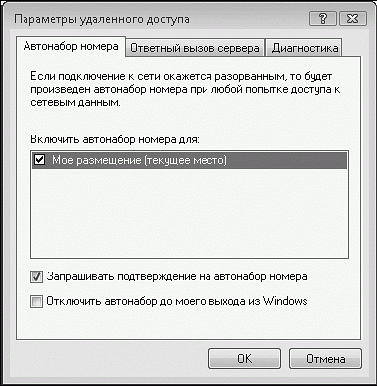 Функция автодозвона позволяет существующему подключению автоматически набирать номер телефона и соединяться с провайдером в случае разрыва связи и при любой попытке доступа к сетевым данным. Чтобы настроить автодозвон, в меню кнопки Пуск необходимо выбрать категорию Подключение, выделить нужное подключение, затем выполнить команду Дополнительно ? Параметры удаленного доступа. Для установки автонабора в области Включить автонабор номера для нужно установить флажок дозвона (рис. 1.1).