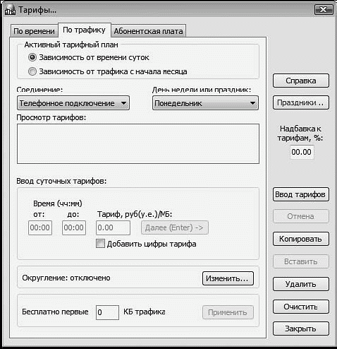 Выбор пункта Основное окно открывает окно, в котором можно задать дополнительные настройки программы. На вкладке Тарифы можно задать стоимость работы в Интернете, начиная от одного часа и заканчивая разными днями недели (например, скидки выходного дня), а также тарифы для разных подключений. В разделе Расчеты находится предупреждение о том, что на счету пользователя осталось меньше определенной суммы денег, например $1, или меньше одной минуты (программа позволяет задать эти параметры как для денежных расчетов, так и для временных промежутков) (рис. 1.6).