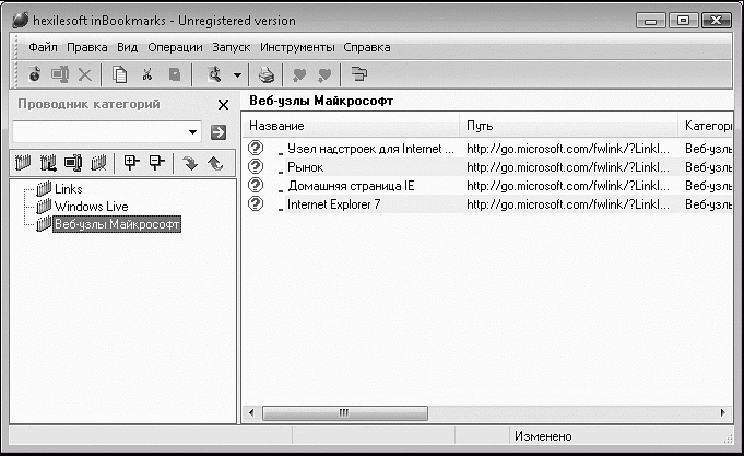 Программа inBookmarks (http://www.hexilesoft.com) отличается удобством просмотра созданной коллекции ссылок. В левой части программы отображена структура разделов коллекции, а в правой размещены объекты выделенного раздела. Значок быстрого доступа, расположенный на Рабочем столе, способствует удобному пополнению коллекции новыми объектами. Список закладок, сохраненных в базе данных программы, доступен с помощью этого значка без открытия основного окна программы (рис. 2.42).