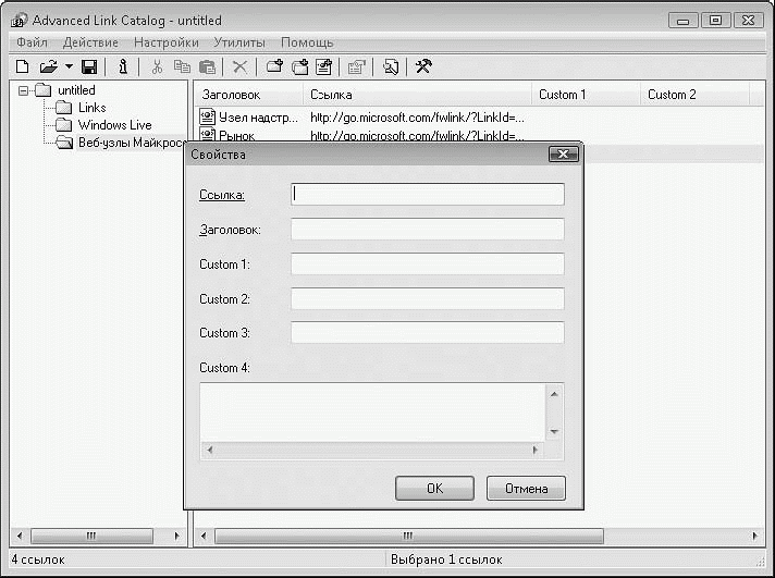 Основное отличие программы Advanced Link Catalog (http://wizetech.com) от аналогов – умение работать с несколькими каталогами ссылок, которые можно сохранять в виде отдельных файлов. Данная возможность позволяет создавать отдельные каталоги для разных задач или разных тем, вместо того чтобы работать с одним большим разветвленным каталогом (рис. 2.44).