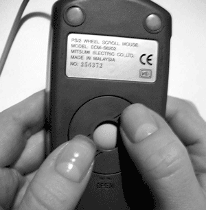 После этого шарик легко можно вынуть и заняться непосредственно очисткой мыши. Поскольку шарик плотно прилегает к валикам, то накопившаяся грязь достаточно сильно пристает к ним. Таким образом, для очистки нужно воспользоваться любым твердым предметом, например основанием карандаша. Пользоваться металлическими вещами, тем более острыми, крайне не рекомендуется, чтобы не поцарапать чувствительные поверхности. Для вытягивания отставших кусочков грязи можете воспользоваться пинцетом.