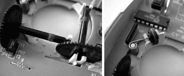 Над «вскрытой» мышью лучше не суетиться, действовать аккуратно. Обязательно воспользуйтесь пинцетом, чтобы очистить валики и прижимной вал (рис. 2.3). Кроме того, уберите все лишнее на пути между датчиками и дисками валов.