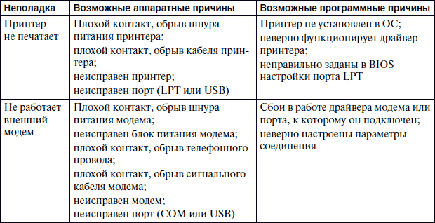Внешние устройства (монитор, клавиатура, мышь, колонки, принтеры и сканеры) о своих неисправностях заявляют недвусмысленно: перестают выполнять свои функции. Обычно выявление поломки начинается с описания «непонятного поведения» одного из внешних устройств (табл. 3.1). Иногда за этими симптомами скрываются более серьезные проблемы, связанные с «внутренностями» системного блока или каких-то программ. Тем не менее диагностику следует начать именно с проверки внешнего устройства и ведущих к нему кабелей и проводов.