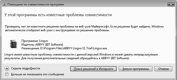 Если же программа впервые установлена и сразу начала «вылетать», возможно, проблема в том, что она слишком старая. В Windows XP она запускается, а в Vista – все, не может. Это довольно частая ситуация, называется она «проблема совместимости». Обычно, как только она возникла, запускается Помощник по совместимости программ. Это утилита, которая информирует пользователя о проблеме, предлагает ознакомиться с ее решением в Интернете, но самое главное – пытается справиться с проблемой (рис. 3.13).