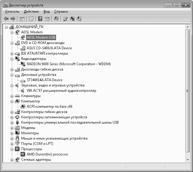 Что, разбежались глаза? Да, здесь вы видите все устройства, подключенные к вашему компьютеру. Чтобы глаза не разбежались окончательно, устройства сгруппированы по своему назначению. Для просмотра содержимого группы щелкните на плюсике слева от ее названия.