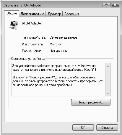 Чтобы разобраться в причине сбоя, двойным щелчком кнопкой мыши на значке устройства откройте окно его свойств. На вкладке Общие вы увидите описание состояния устройства и проблемы, вызвавшей неполадки в работе (рис. 3.23).