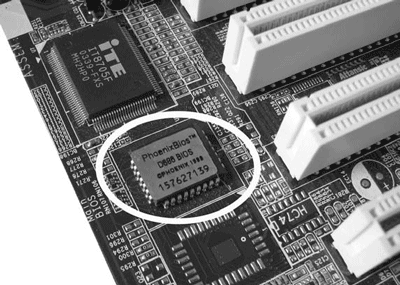 BIOS – первая программа, которая выполняется на компьютере сразу после включения. О ней мы уже достаточно поговорили в гл. 3. Она записана в специальной микросхеме flash-памяти материнской платы (рис. 4.4). Пользователь может самостоятельно записать в микросхему новую версию BIOS, предварительно скачав ее с сайта производителя платы.