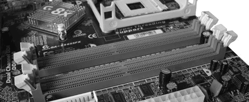 Слоты оперативной памяти представляют собой симметричные разъемы. Чтобы вы случайно не вставили в них модули неподходящего типа, на слотах есть ключи, то есть пластиковые выступы. На модуле памяти соответствующего типа в этом же месте размещен вырез. И выступ, и вырез смещены от центра, поэтому есть только один вариант установки памяти на плату. По краям слота оперативной памяти расположены пластмассовые замки, которые автоматически защелкиваются при правильной установке. Защелки жестко держат модули памяти, чтобы они не выпали при вибрации или перемещении системного блока.