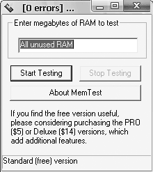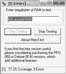 В процессе проверки памяти в нижней части окна программы MemTest вы будете видеть информацию о протестированном объеме ОЗУ (в процентах) и количестве обнаруженных ошибок (рис. 4.33). Вы можете в любой момент прервать процесс, нажав кнопку Stop Testing (Остановить тестирование) в окне программы MemTest.