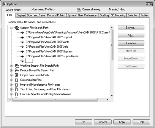 Вкладка Files (Файлы) (см. рис. 2.1) содержит заданные по умолчанию пути поиска файлов поддержки системы AutoCAD.