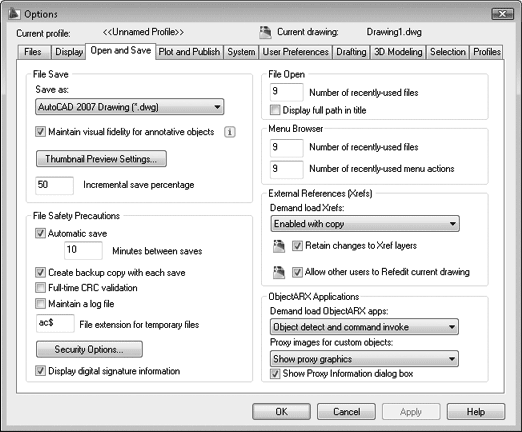 Вкладка Open and Save (Открытие и сохранение) (рис. 2.6) используется для настройки операций сохранения и открытия файлов чертежей.