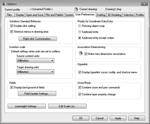 Флажок Shortcut menus in drawing area (Контекстные меню в рабочей области) включает режим, при котором нажатие правой кнопки мыши в рабочей области вызывает контекстное меню. При выключенной опции нажатие правой кнопки соответствует нажатию клавиши Enter.