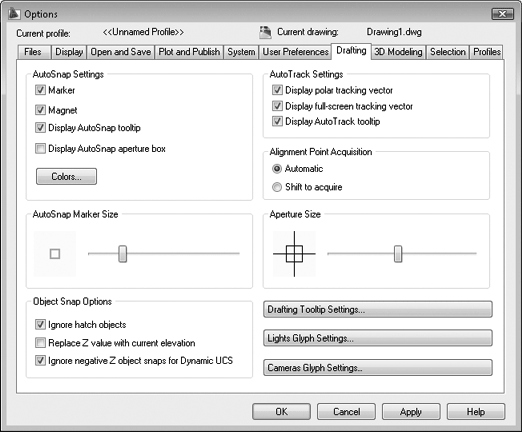 Вкладка Drafting (Черчение) (рис. 2.18) позволяет управлять настройкой автоматической объектной привязки и автоматического отслеживания.