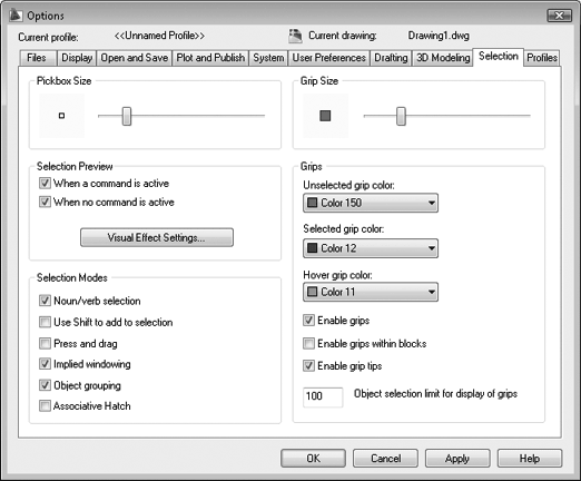 • Флажок Noun/verb Selection (Выбор объекта/действия) включает режим выбора объектов перед вызовом команды. Вызванная команда воздействует на предварительно выбранные объекты, однако не все команды поддерживают предварительный выбор.